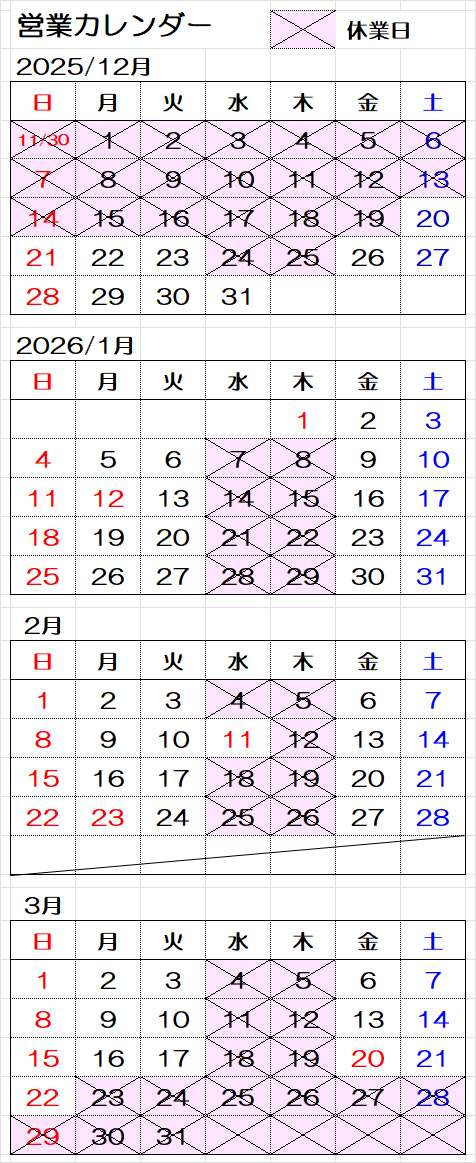 営業カレンダー <お願い> 道具がなくなった場合、その時点で予告なく閉店させていただきます。 また、その翌日も営業できないことがございます。 臨時に休業する場合があります。 詳しく、ホームページにてお知らせいたします。 ご確認お願いいたします。
