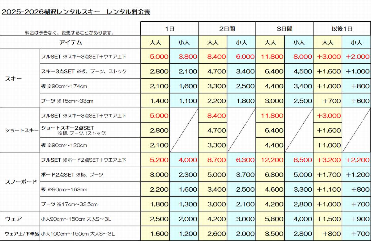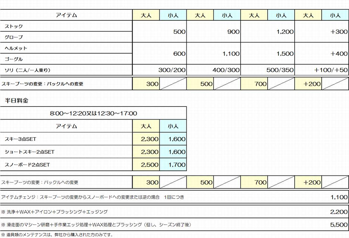 ウェア・小物・半日料金など